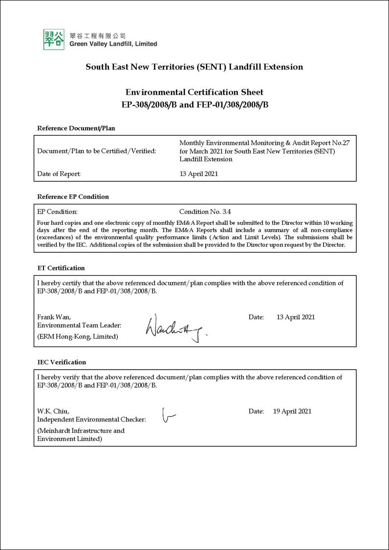 Since then, applications for Variation of an Environmental Permit (No. VEP-531/2017) were submitted to EPD and the Variation of Environmental Permits (EP-308/2008/A and EP-308/2008/B) were granted on 6 January 2012 and 20 January 2017, respectively, as the Hong Kong SAR Government has decided to reduce the scale of the design scheme of SENTX assessed in the approved EIA Report and SENTX will only receive construction waste. In May 2018, a Further Environmental Permit (FEP) (FEP-01/308/2008/B) was granted to the SENTX’s contractor, Green Valley Landfill, Limited (GVL).