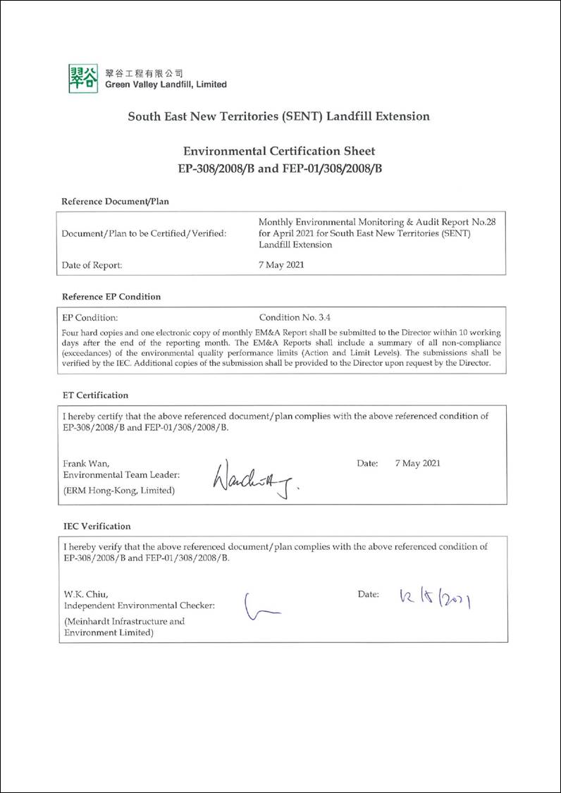 Since then, applications for Variation of an Environmental Permit (No. VEP-531/2017) were submitted to EPD and the Variation of Environmental Permits (EP-308/2008/A and EP-308/2008/B) were granted on 6 January 2012 and 20 January 2017, respectively, as the Hong Kong SAR Government has decided to reduce the scale of the design scheme of SENTX assessed in the approved EIA Report and SENTX will only receive construction waste.  In May 2018, a Further Environmental Permit (FEP) (FEP-01/308/2008/B) was granted to the SENTX’s contractor, Green Valley Landfill, Limited (GVL).