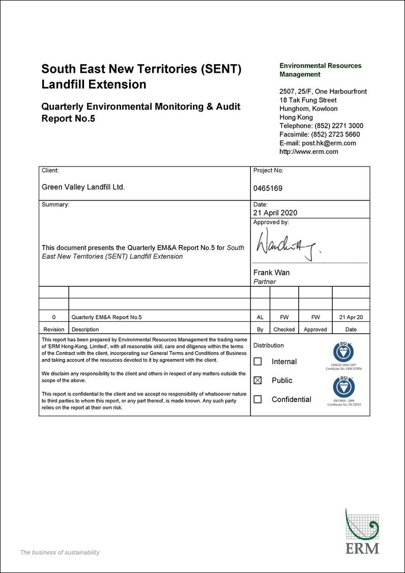 The SENT Landfill Extension (SENTX) forms an integral part in the Strategic Plan in maintaining the continuity of landfill capacity in the Hong Kong for the cost-effective and environmentally satisfactory disposal of waste. ERM-Hong Kong, Limited (ERM) is commissioned to undertake the role of Environmental Team (ET) for the construction, operation/restoration and aftercare of SENTX Project (“the Project”) in accordance with the requirements specified in the Environmental Permit (EP), updated Environmental Monitoring and Audit (EM&A) Manual, the approved Environmental Impact Assessment (EIA) Report of the Project taking account of the latest design and other relevant statutory requirements. The construction (not including works related to site clearance and preparation) of the Project commenced on 2 January 2019.